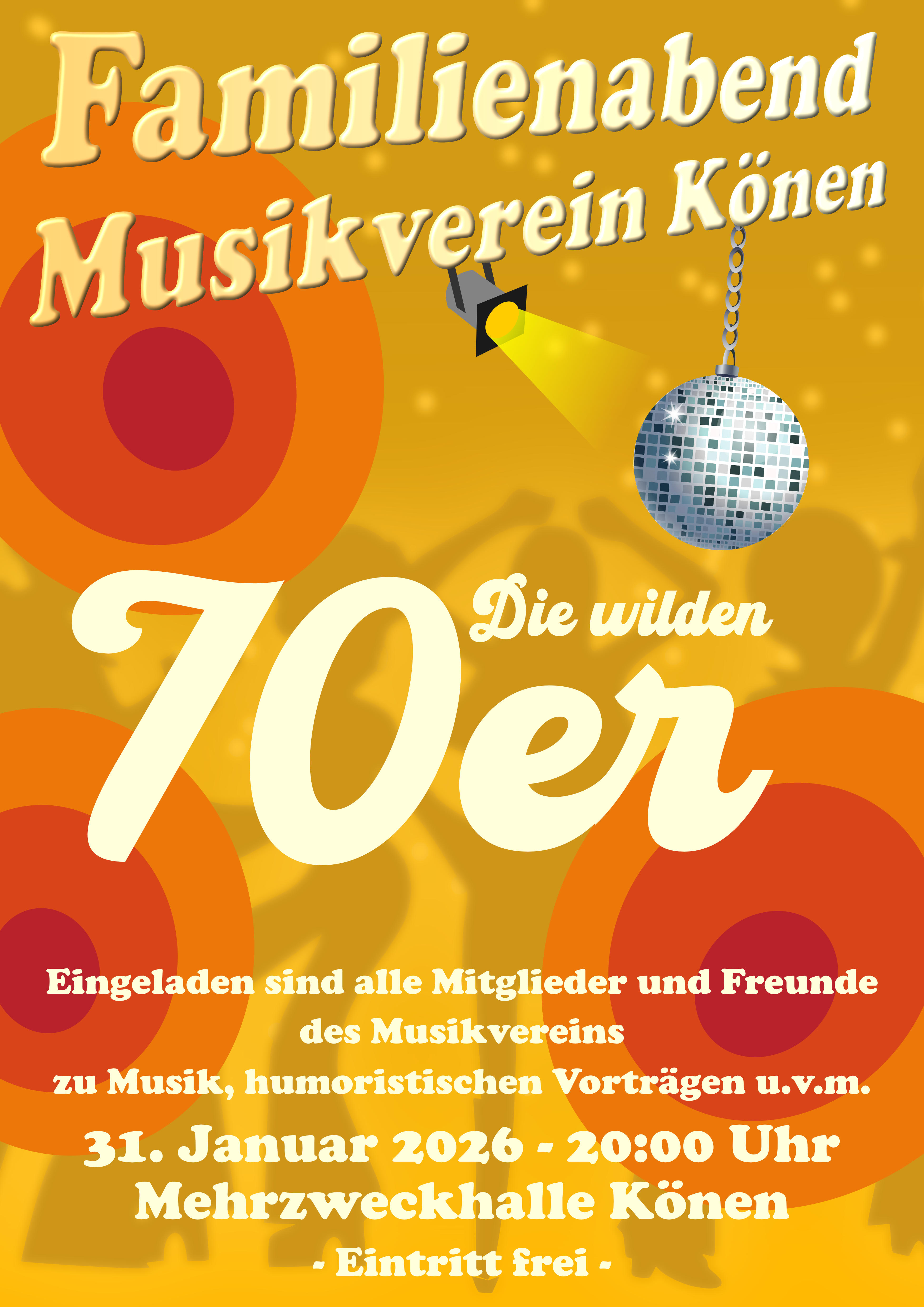 Willkommen in den wilden 70er Jahren heißt es am 31. Januar um 20 Uhr in der Mehrzweckhalle Könen anlässlich des Familienabends, zu dem der Musikverein „Harmonie“ Könen seine Mitglieder und Freunde herzlich einlädt.